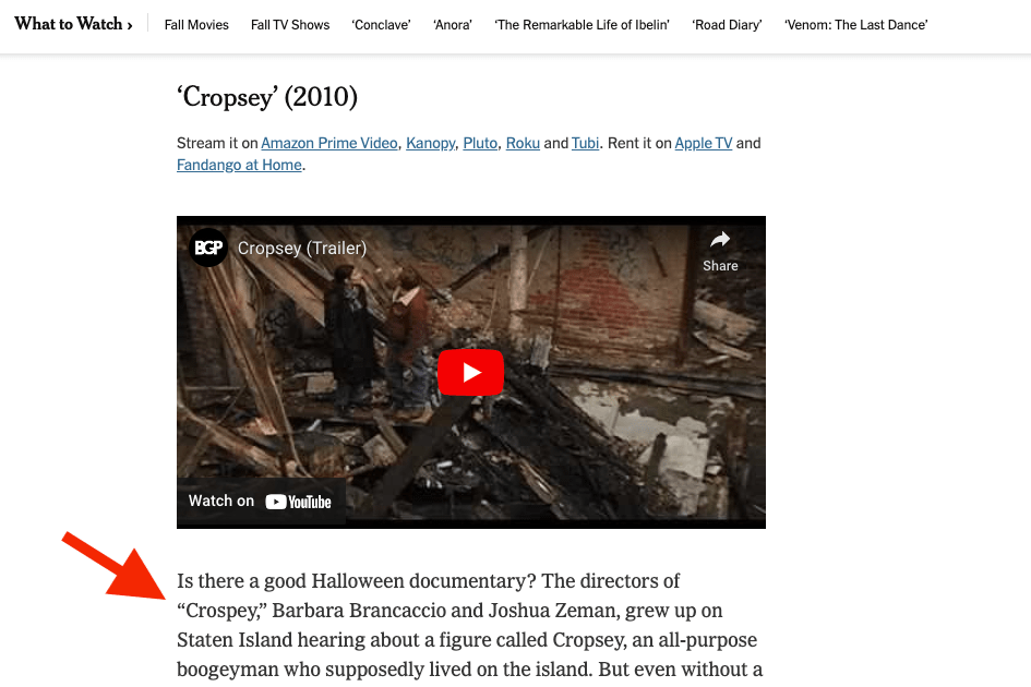 October 30, 2024: Online readers looking for recommendations on documentary films to stream might have noticed a discrepency with one of the three titles posted: ‘Cropsey’.